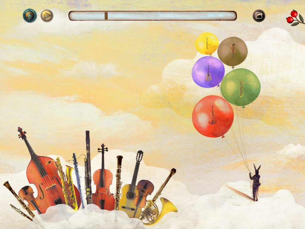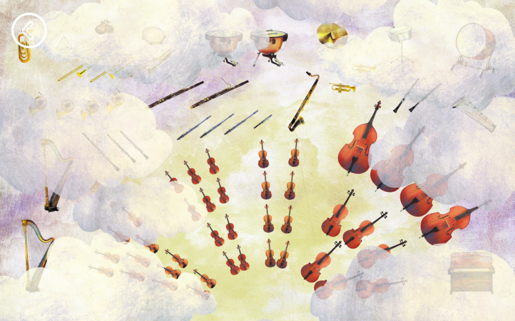 Découvrez les différents instruments de l’orchestre de Tchaïkovski. En touchant les nuages ils sortent de l’écran et laissent apparaitre les différents pupitres. En touchant un instrument vous entendez son timbre et vous avez une description de l’instrument.